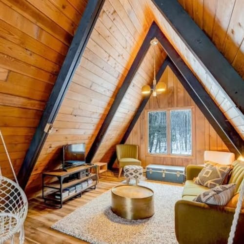 This 278 sq ft A-frame cabin turns iconic charm into a fully functional home. With a lofted bedroom and a downstairs living space that includes a kitchen and bath, this layout is built for comfort.
